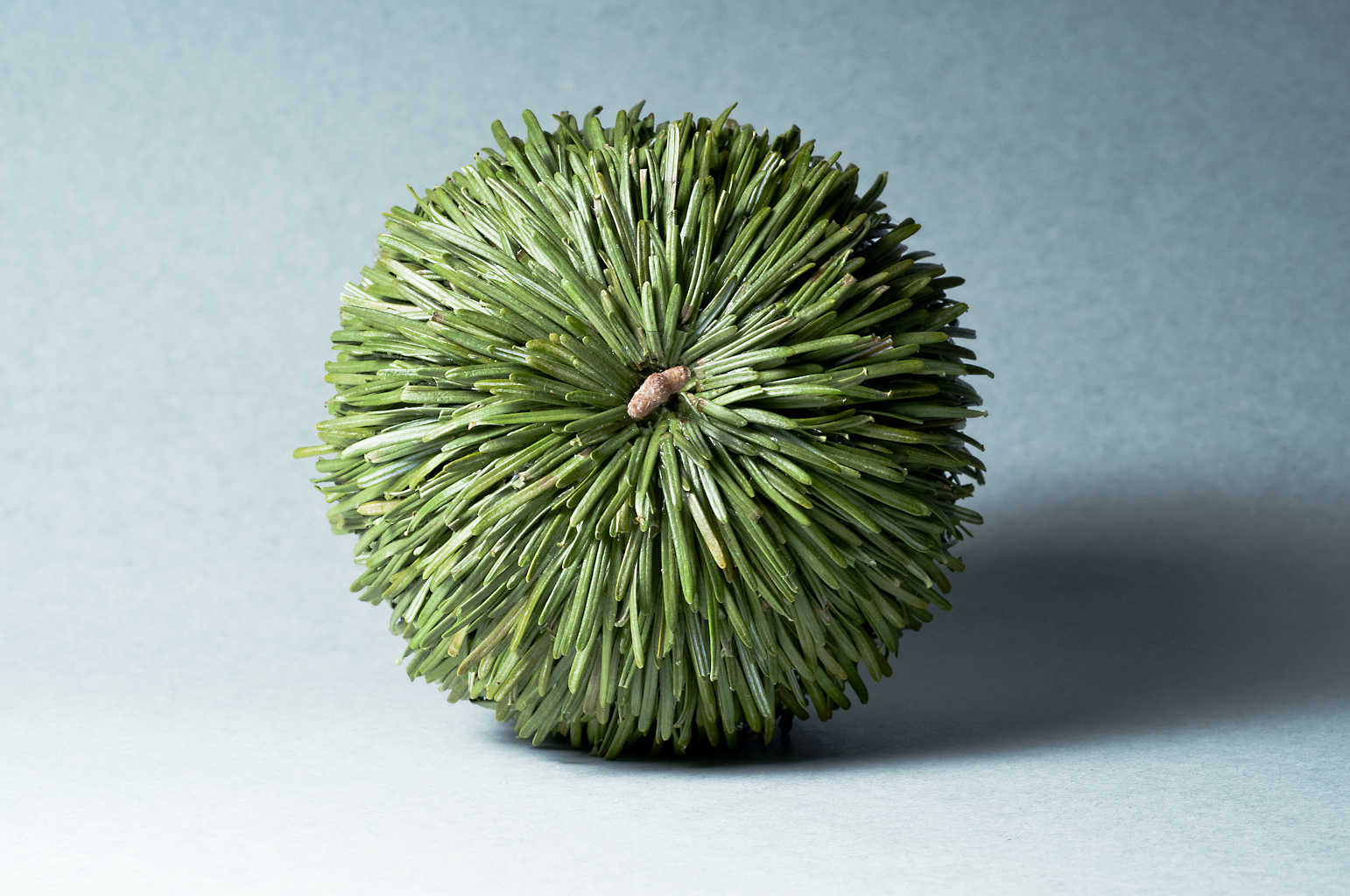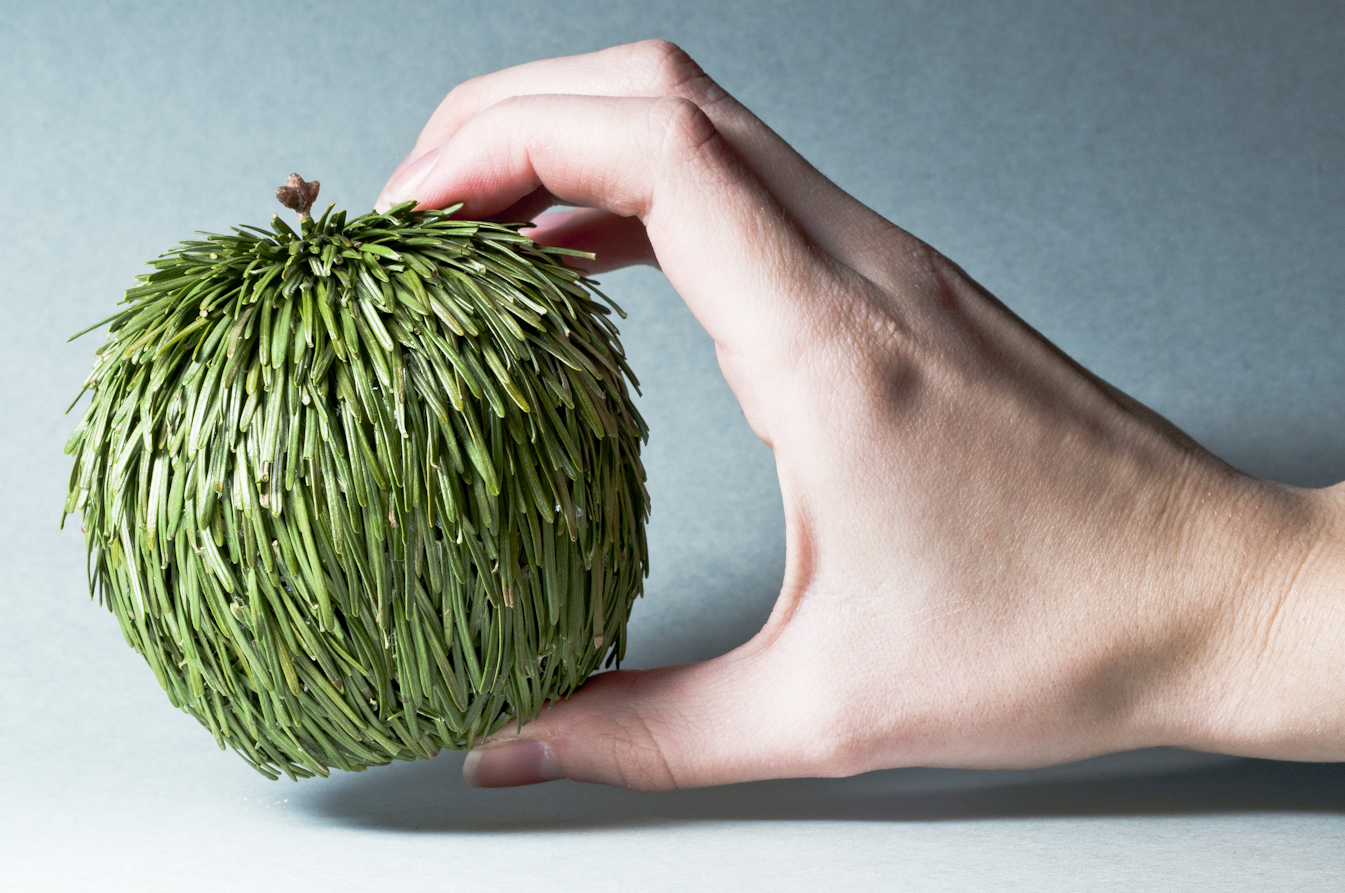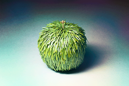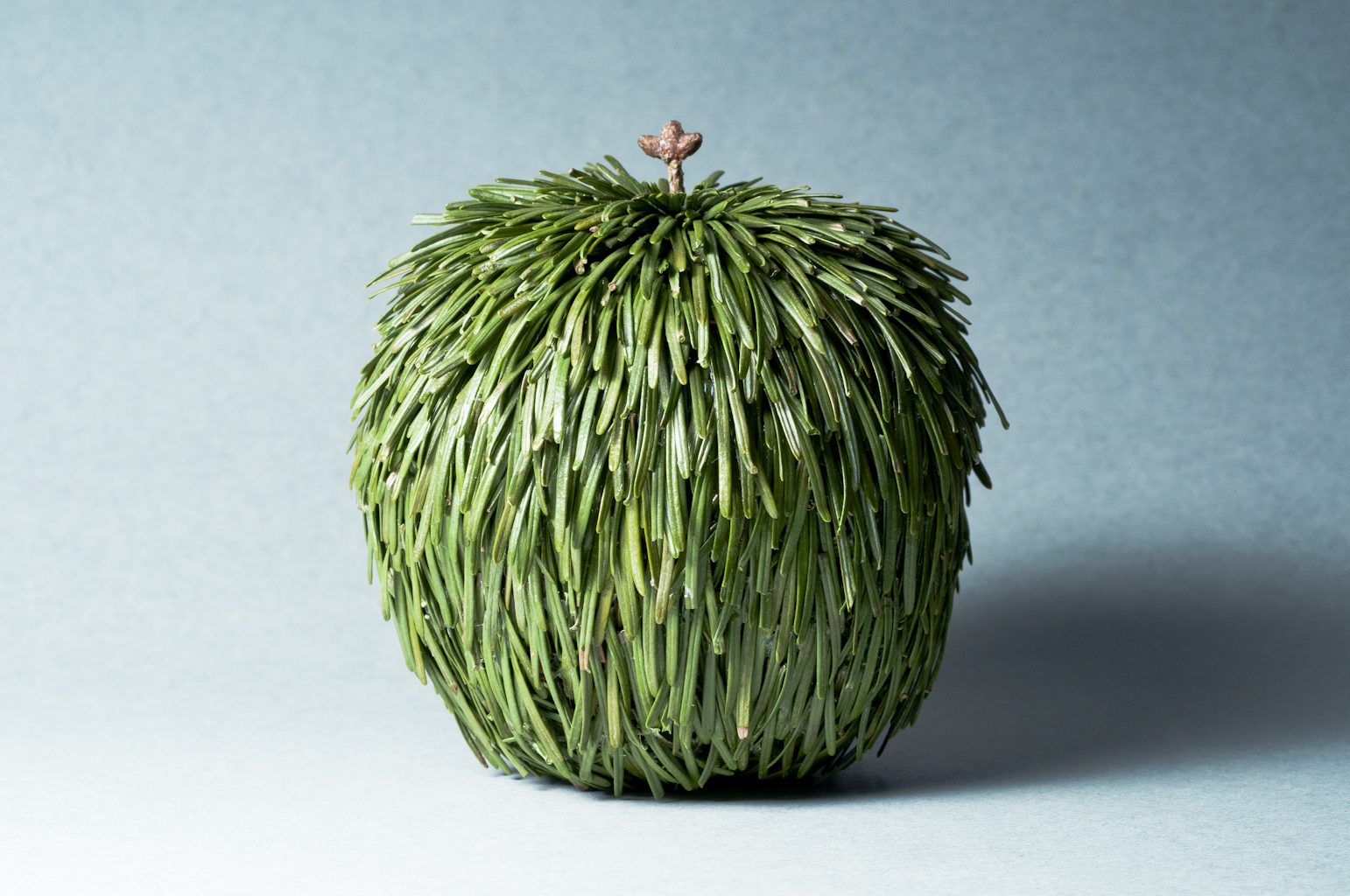 One of the many puns that I've created, this is the pine apple. It's an apple-sized apple-shaped sculpture that is made entirely of pine needles, a pine wick, and glue.