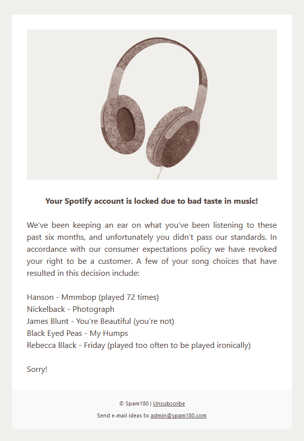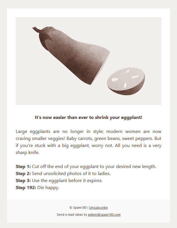 ![]() ![]() ![]() ![]() ![]() Spam180 - 2019 Spam180.com is a fun mailing list that anyone can subscribe to that sends you weekly "spam" e-mail that's humourous. The e-mails are parodies of regular spam or trendy topics. Once you subscribe, you'll get an e-mail every Wednesday afternoon. You'll receive a random e-mail out of all our spam e-mails, so if you and your friend sign up together, you'll both be seeing different e-mails. You can unsubscribe at any time. Some of the topics are mature so be warned! |